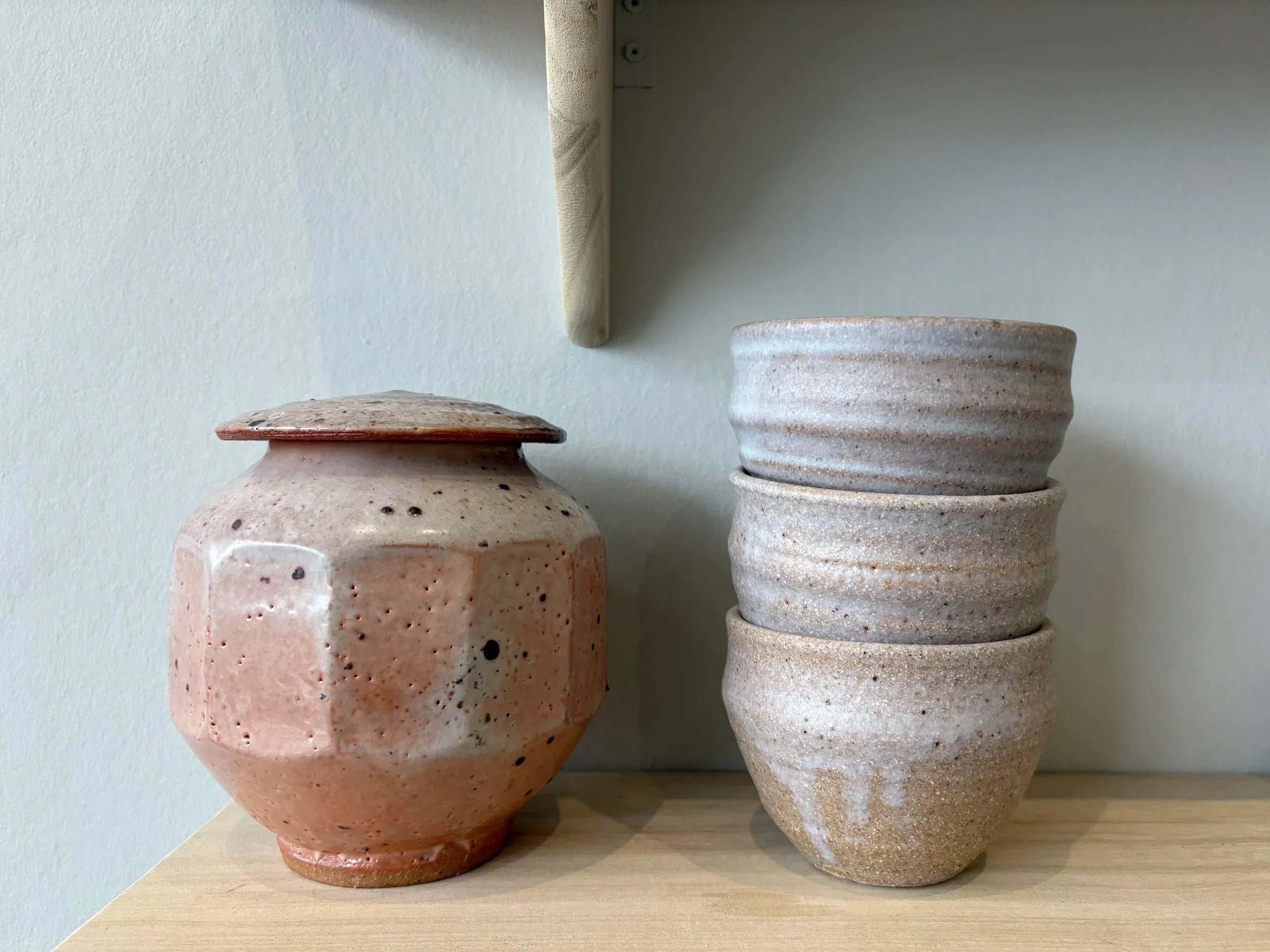 Lidded Jar by Jynsym Ong, £150. Beakers by Grace McCarthy £30 each.
