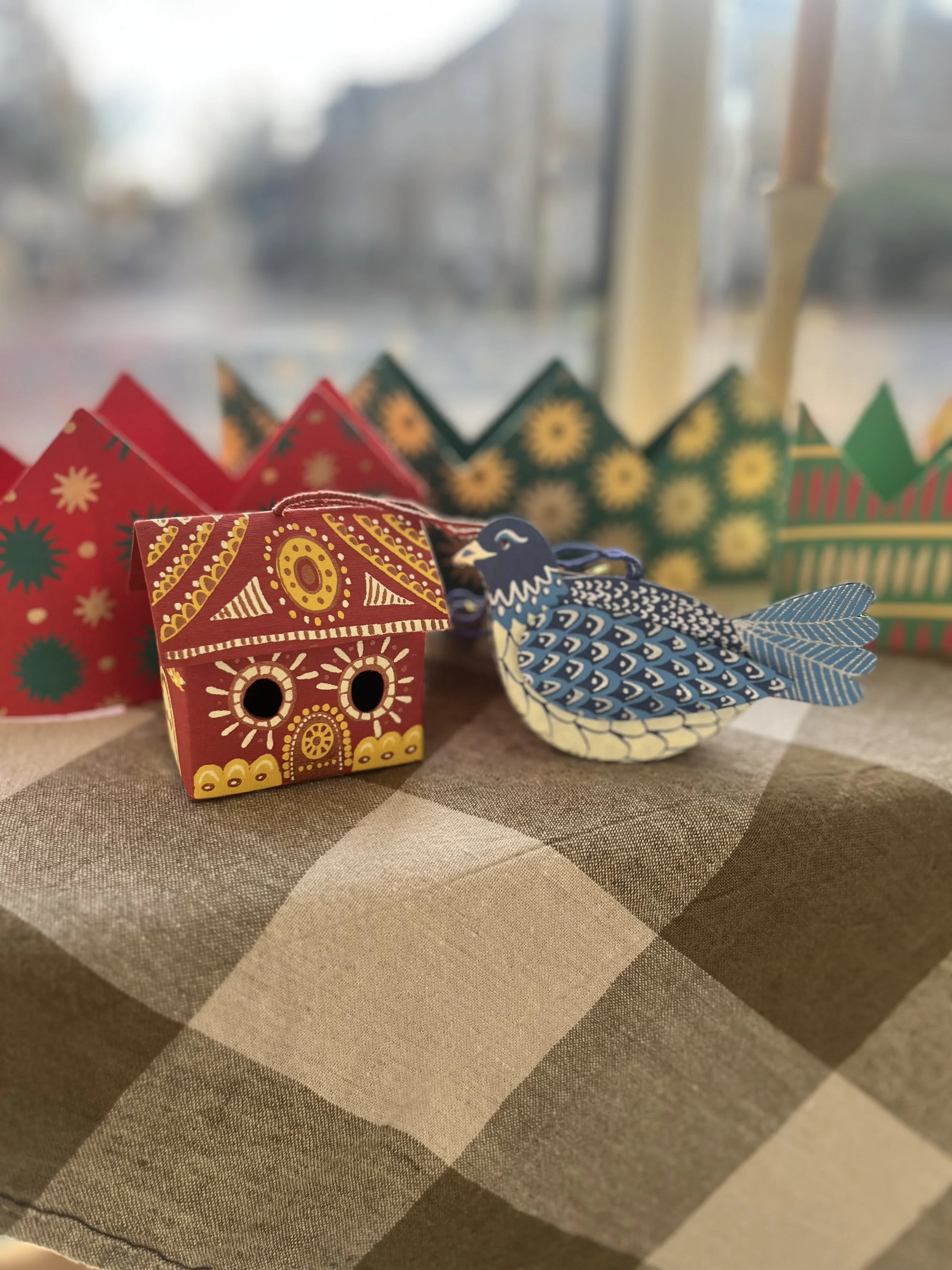 A Collection of beautiful hand-printed paper ornaments for the tree: A Gingerbread House £7, a Dove £7 and Mistletoe £6 (available in store only).