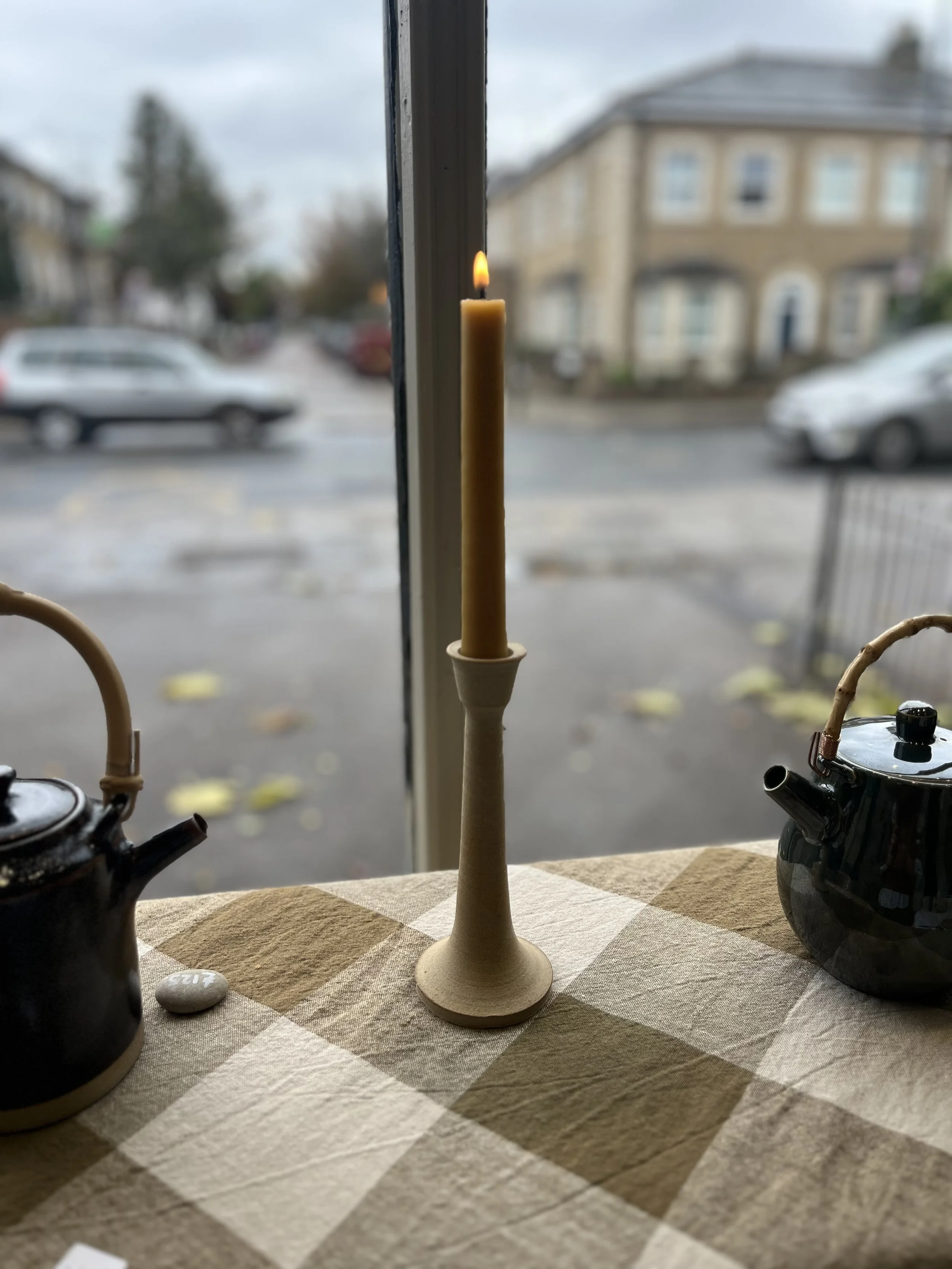 Hand-thrown Candleholder, £38, with Organic Candles - the perfect light at the festive table.